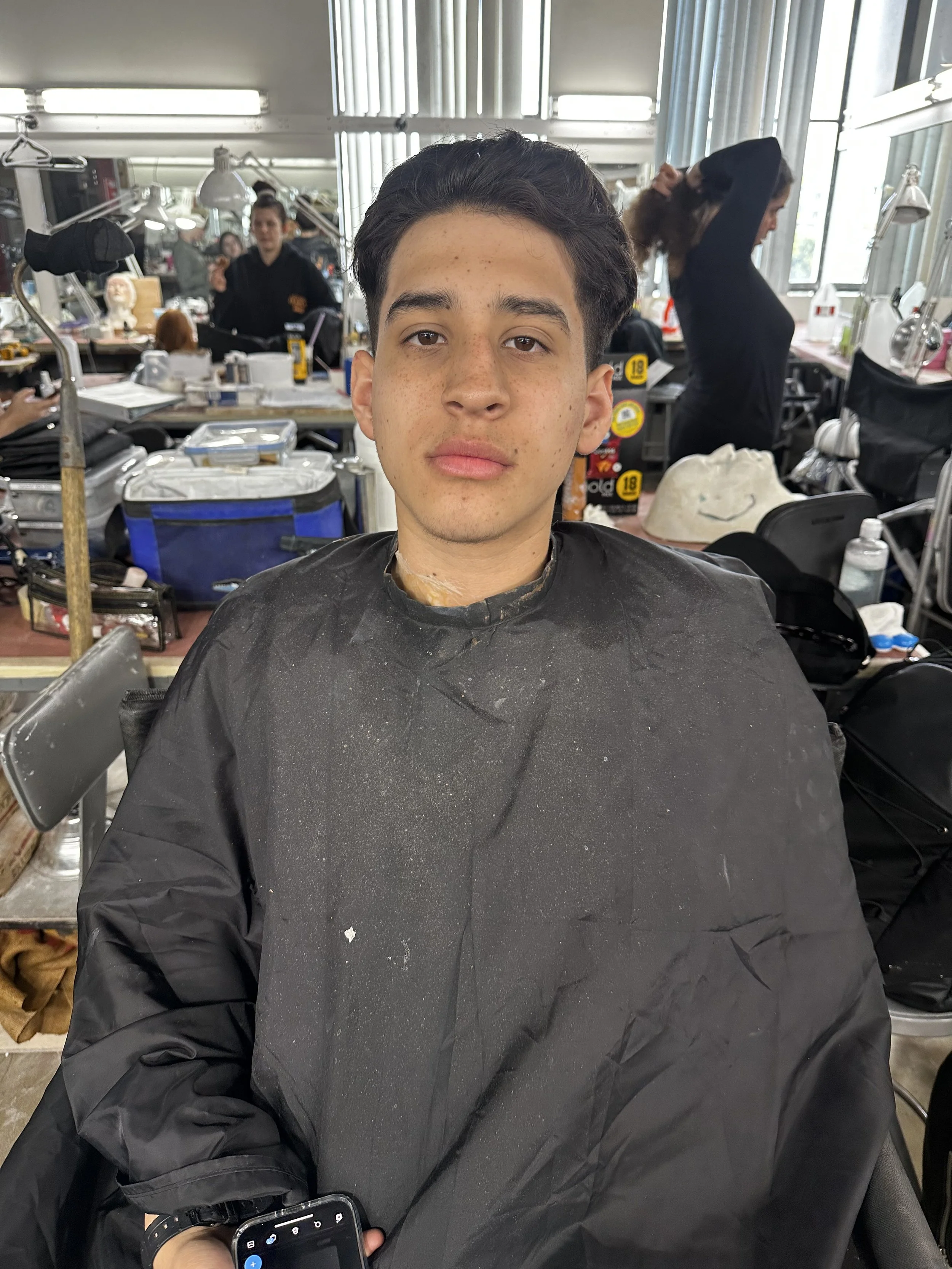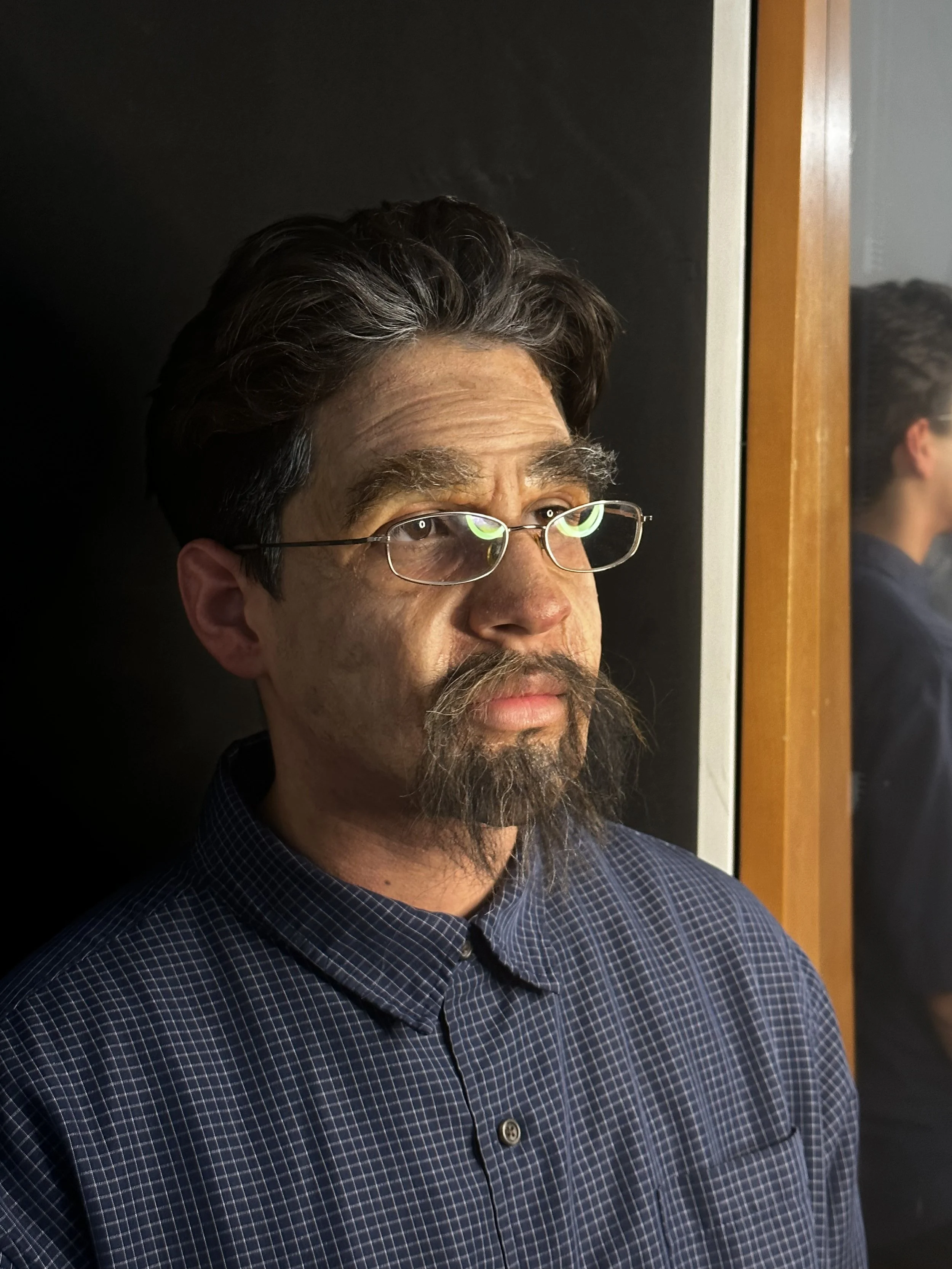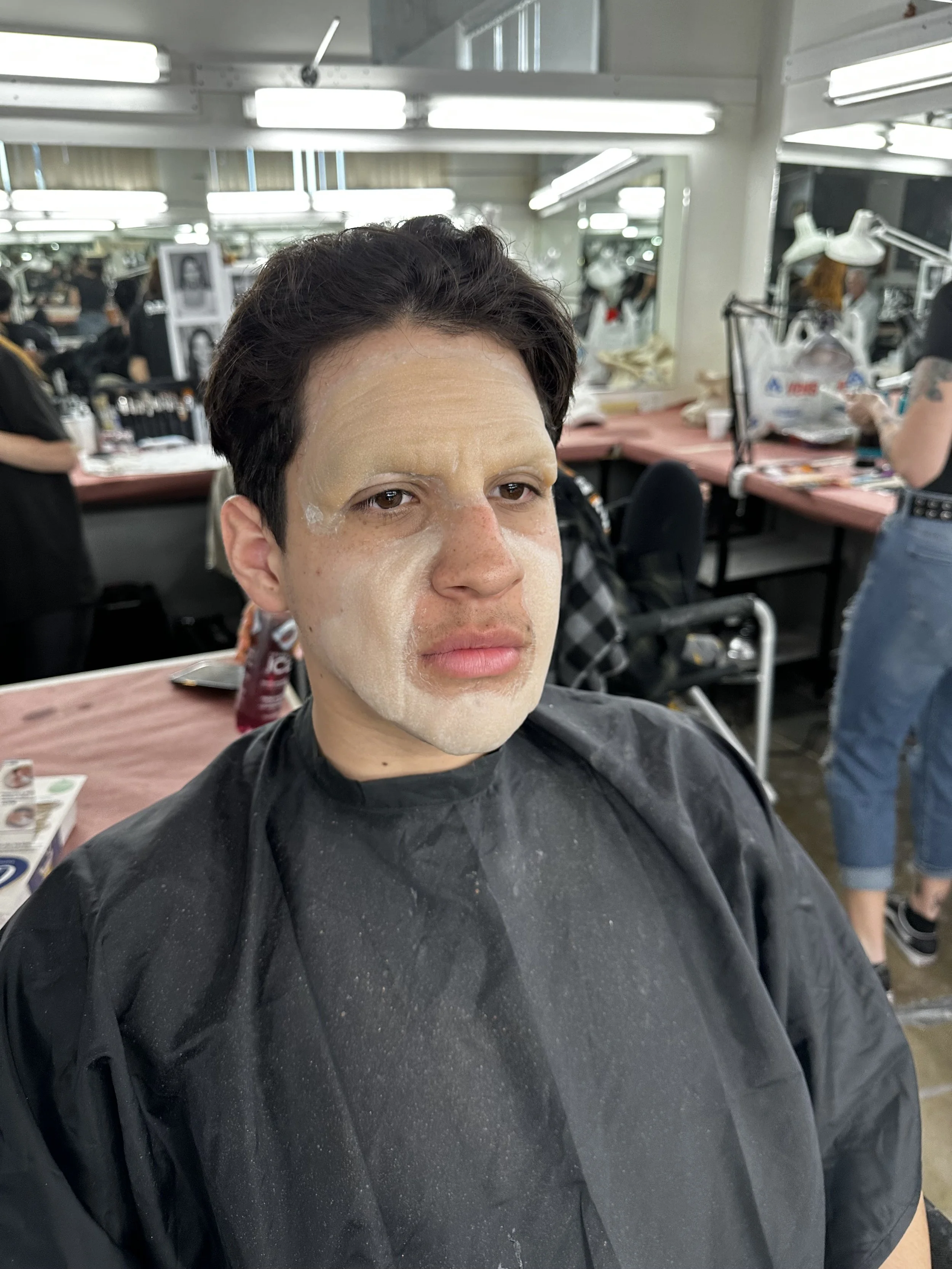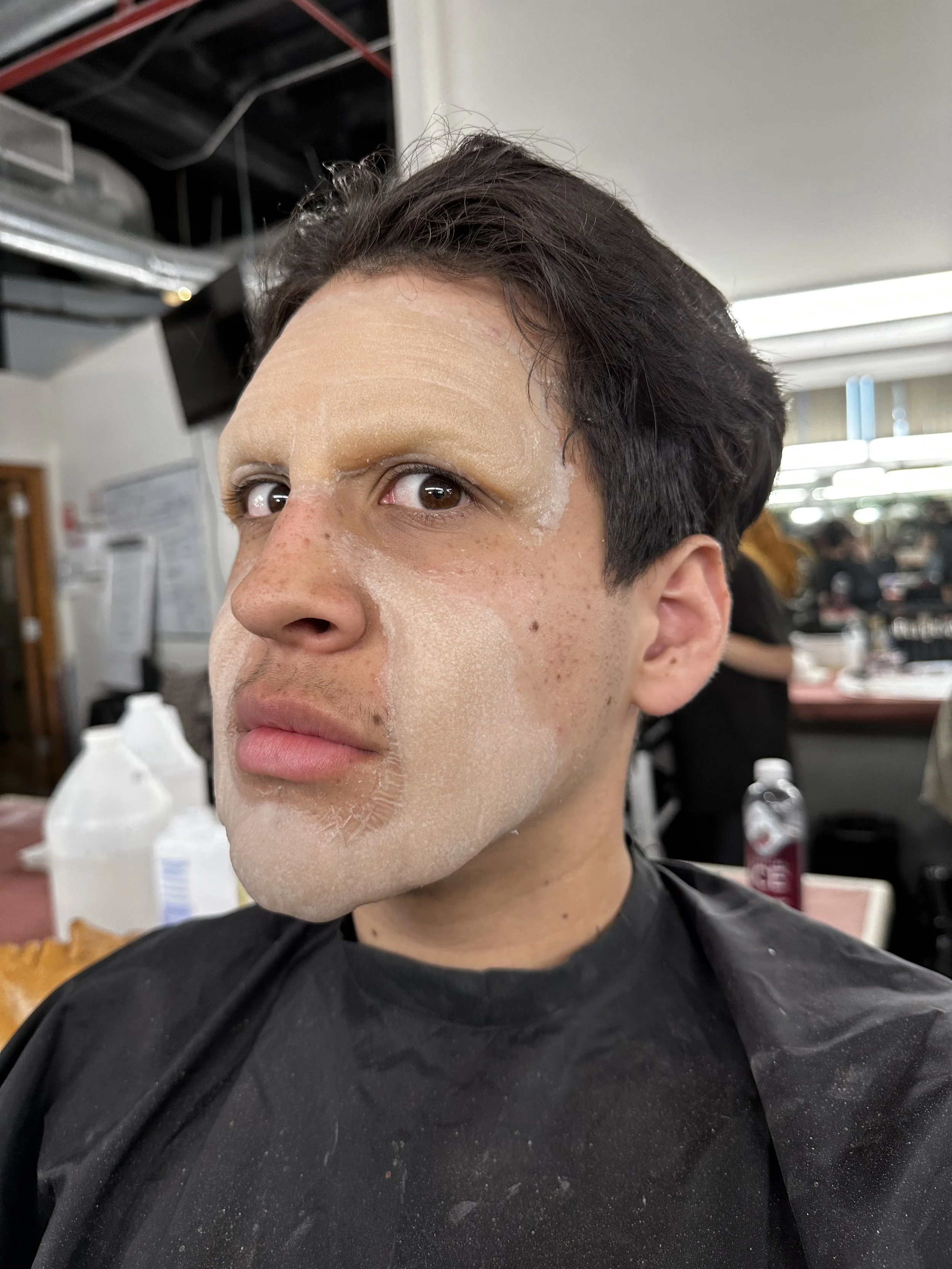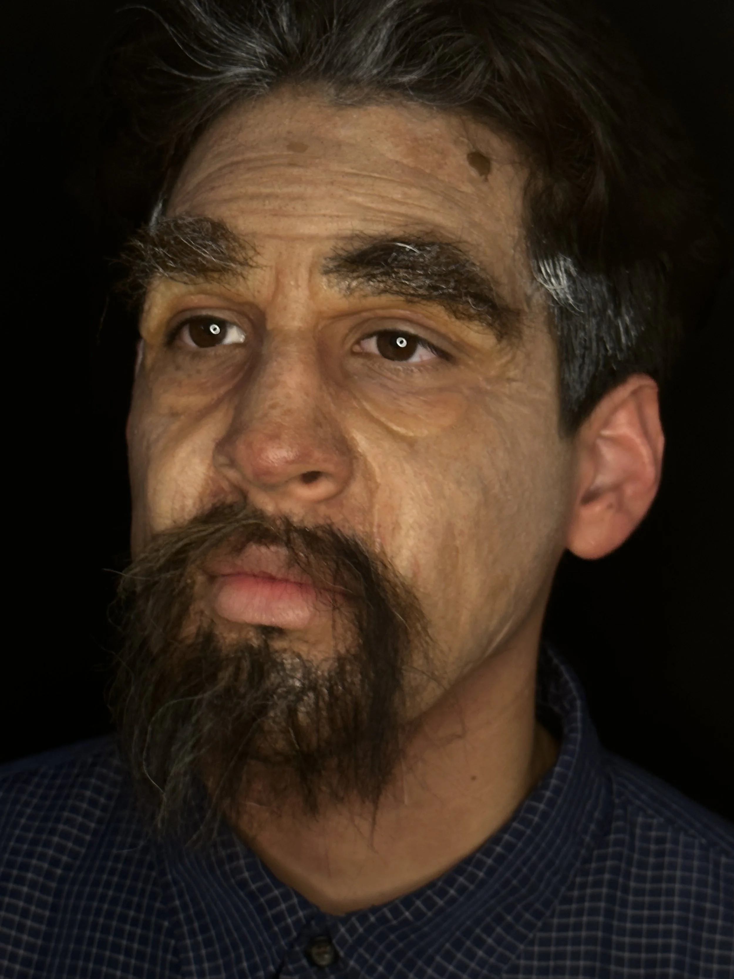 Silicone forehead, Silicone cheek/chin appliance, PTM eye bags and mole, lied eyebrows and beard, greyed hair